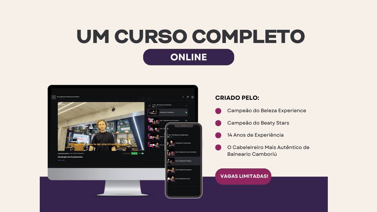 Com + de 15 Aulas que vão desde como lidar com clientes com medo da mudança, a técnicas de aplicação de tendências, superação de obstáculos e assinatura pessoal nos cortes.